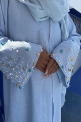 Une abaya manches longues, doublée au niveau des bras pour plus d’opacité, avec des perles cousues à la main une à une sur les manches pour une finition raffinée.