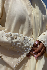 • Une abaya manches longues, doublée au niveau des bras pour plus d’opacité, avec des perles cousues à la main une à une sur les manches pour une finition raffinée.