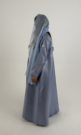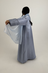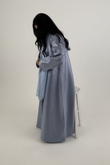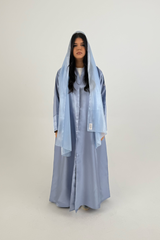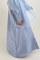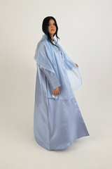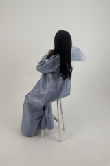 Ce bleu clair m’a inspirée pour son côté frais et lumineux. Il illumine le teint et donne une vraie douceur au tissu satiné. J’ai voulu une coupe qui tombe bien, sans trop structurer la silhouette. Sheila assorti inclus.