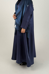 Ce bleu intense m’a tout de suite inspirée, je voulais une abaya qui se démarque sans être trop voyante. Le satin lui donne une belle profondeur et met en valeur sa coupe épurée. Sheila assorti inclus.