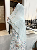 Ce bleu océan, je l’ai choisi pour son côté éclatant mais doux. J’ai voulu une coupe fluide et un tissu confortable pour un maximum de légèreté. Un mukhawar idéal pour celles qui aiment les couleurs fraîches et faciles à porter. Shela assorti inclus.