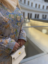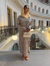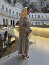 J’aime l’association du bleu pastel et du jaune pour son côté frais et équilibré. J’ai voulu un mukhawer lumineux mais facile à porter au quotidien. Son tissu est doux et léger, idéal pour une tenue confortable et fluide. Shela assorti inclus.